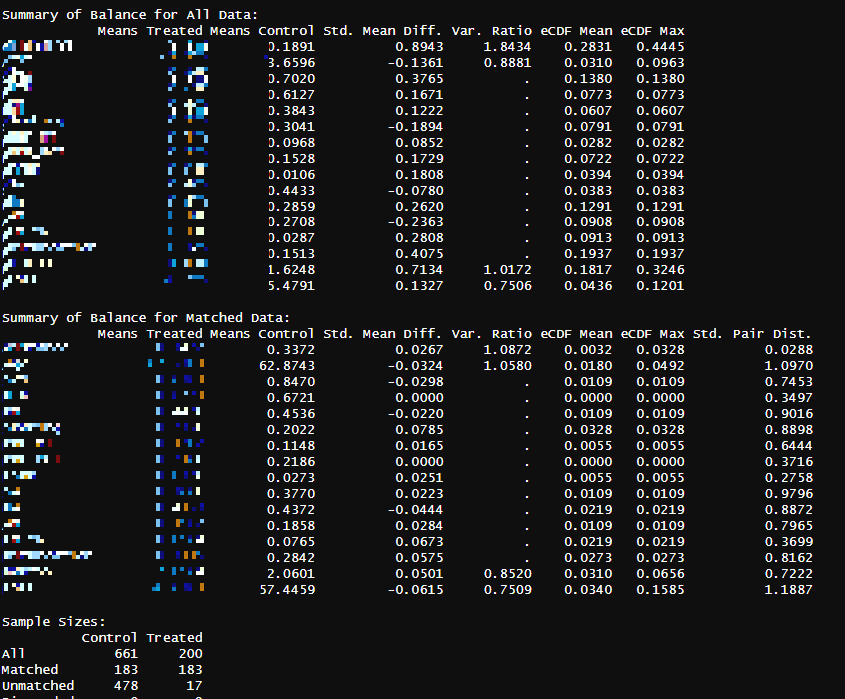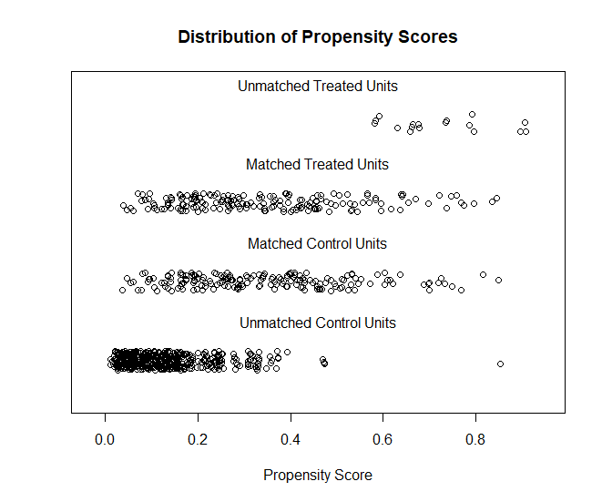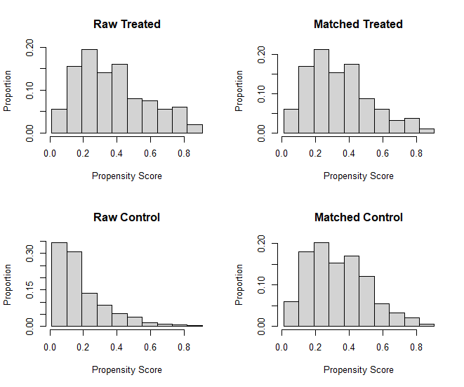 match 된 control과 case(treated)의 ps 분포가 유사해 짐을 확인 할 수 있다.